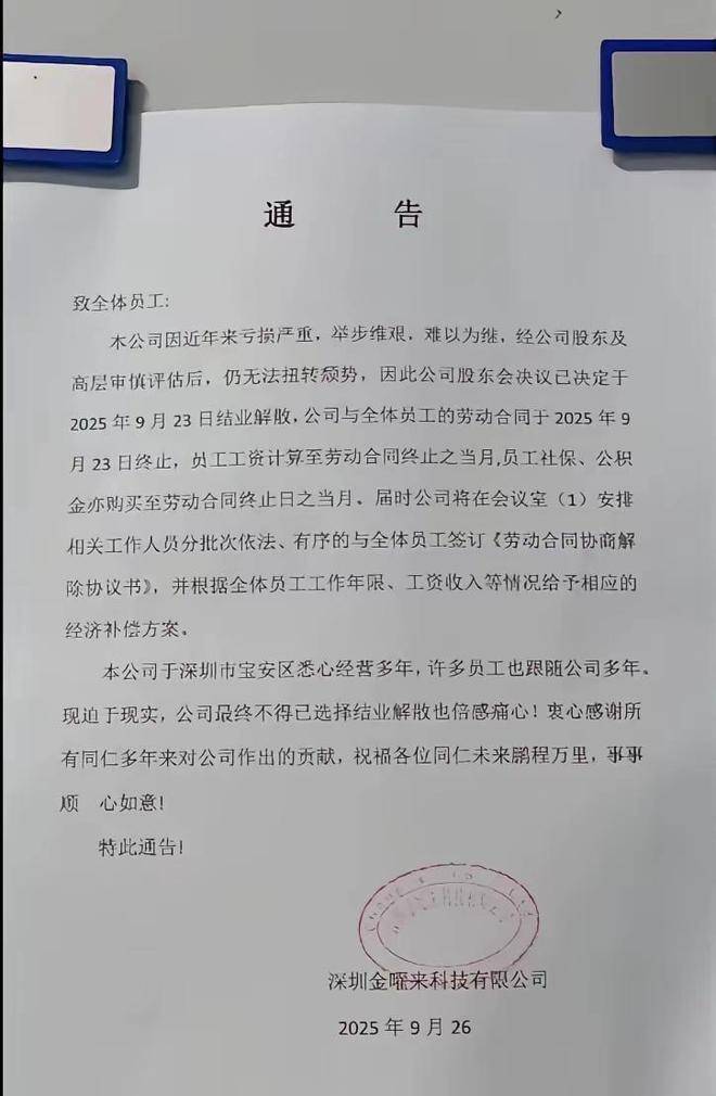 9月26日,深圳金曜来科技有限公司发布了通知,告知全体员工,因为公司近年来亏损严重,难以继续维持,所以经过公司股东及高层评估后,但仍然没有办法扭转局面,只能无奈关停公司。